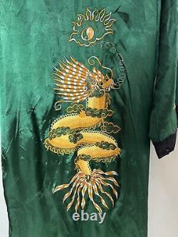 Vintage Asian Inspired Reversible Silky Long Bath Robe Men's L Embroidery Black Green, missing belt.