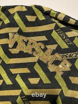 Versace La Greca Embroidered Sequence Silk Bathrobe In Khaki Size Medium. A high-fashion twist on home wear, this plush bathrobe boasts Versace embroidery and the signature La Greca print.